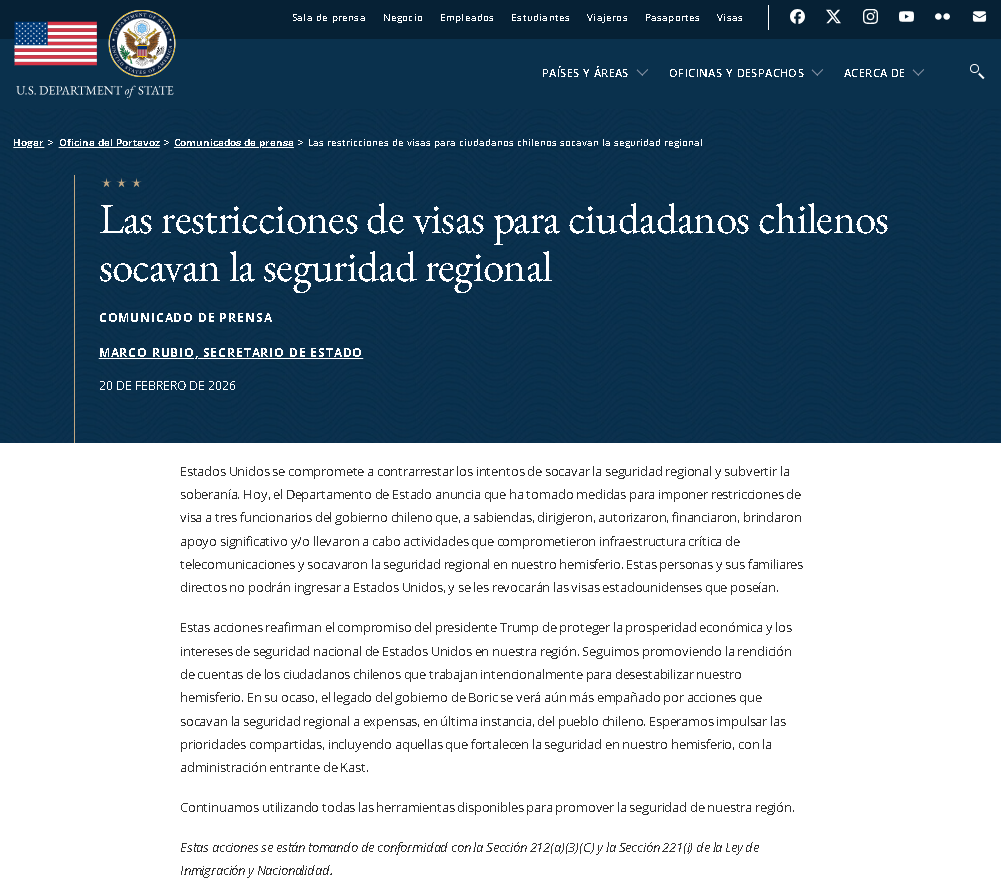 (360Noticias) El secretario de Estado, Marco Rubio, anunció restricciones de visa contra tres funcionarios del gobierno chileno, acusándolos de haber participado en acciones que “comprometieron infraestructura crítica de telecomunicaciones y socavaron la seguridad regional”.
