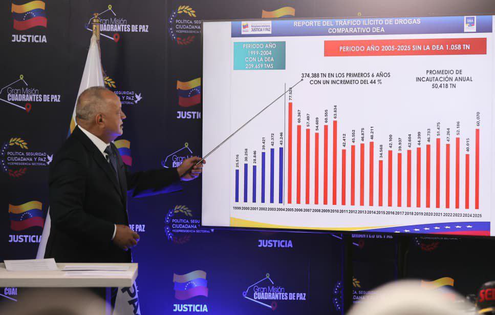 Cabello resaltó que la referida cifra es «la mayor cantidad que se ha capturado desde el año 2010, que es el año comparativo, los seis primeros años de haber roto con la DEA», que es un ente conocido por el mundo «que se dedica al narcotráfico internacional».
