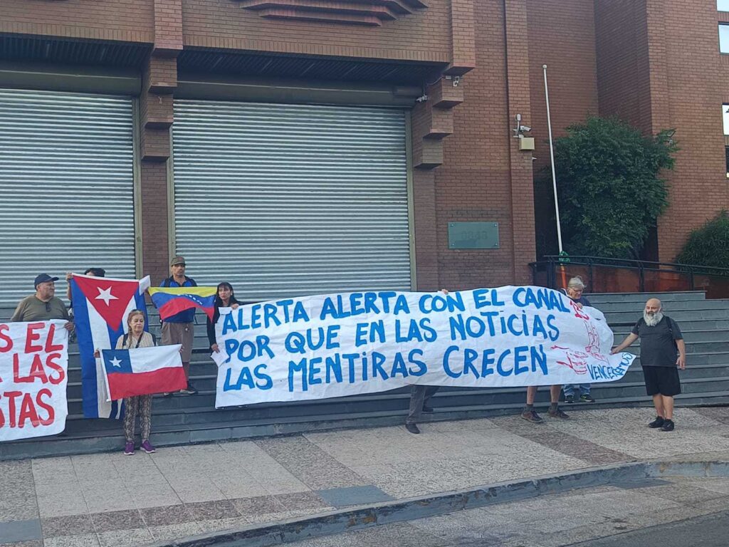 La protesta fue convocada por la Internacional Antifascista, capítulo Chile, junto a la Brigada Internacionalista Ramón Allende Garcés. Medio centenar de manifestantes se congregaron en el frontis del canal para expresar su rechazo a la línea informativa del medio, al que acusan de tergiversar informaciones relacionadas con la política internacional y, particularmente, con conflictos y tensiones que involucran las egresión militares y bloqueos de los Estados Unidos a países como Cuba, Venezuela e Irán.